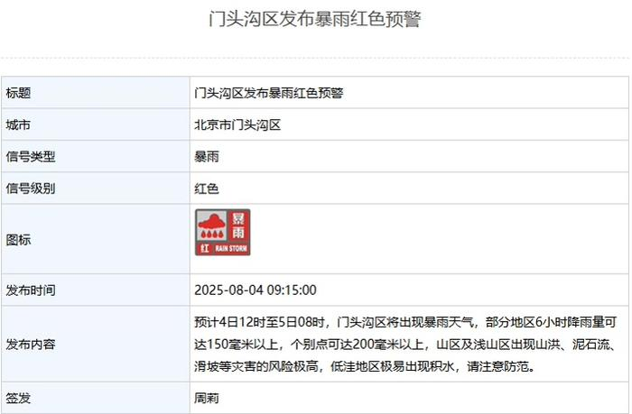 预计4日12时至5日08时,门头沟区将出现暴雨天气,部分地区6小时降雨量可达150毫米以上,个别点可达200毫米以上,山区及浅山区出现山洪、泥石流、滑坡等灾害的风险极高,低洼地区极易出现积水,请注意防范。