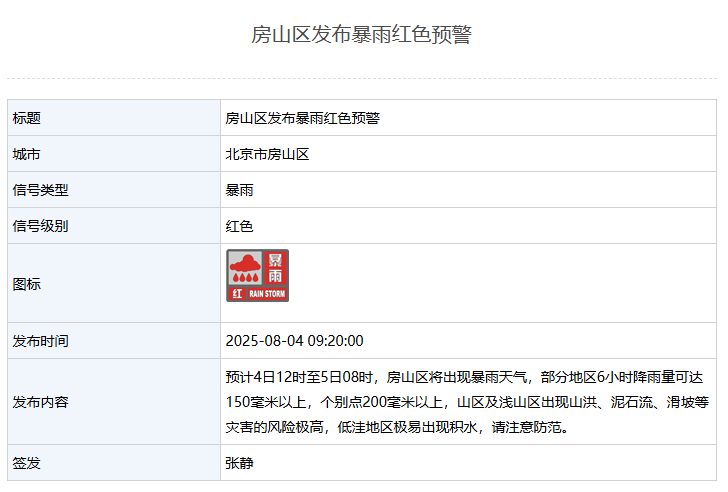 预计4日12时至5日08时,房山区将出现暴雨天气,部分地区6小时降雨量可达150毫米以上,个别点200毫米以上,山区及浅山区出现山洪、泥石流、滑坡等灾害的风险极高,低洼地区极易出现积水,请注意防范。