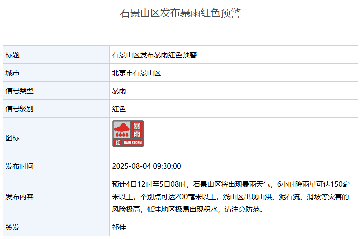 北京市气象台8月4日9时10分发布暴雨橙色预警:预计8月4日12时至5日8时慧眼智行,大部分地区将出现1小时雨量70毫米或6小时雨量100毫米以上的强降水,其中,房山、门头沟、石景山等区的部分地区6小时降雨量可达150毫米以上,个别点200毫米以上,山区及浅山区出现山洪、泥石流、滑坡等灾害的风险极高,低洼地区极易出现积水,请注意防范。
