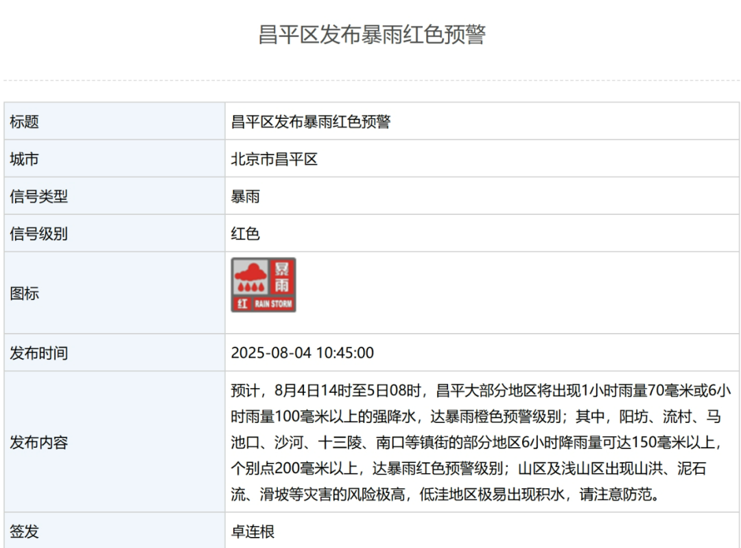 预计,8月4日14时至5日08时,昌平大部分地区将出现1小时雨量70毫米或6小时雨量100毫米以上的强降水,达暴雨橙色预警级别;其中,阳坊、流村、马池口、沙河、十三陵、南口等镇街的部分地区6小时降雨量可达150毫米以上,个别点200毫米以上,达暴雨红色预警级别;山区及浅山区出现山洪、泥石流、滑坡等灾害的风险极高,低洼地区极易出现积水,请注意防范。