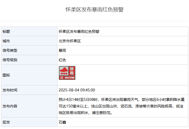 预计4日14时至5日08时,怀柔区将出现暴雨天气,部分地区6小时累积降水量可达150毫米以上,浅山区出现山洪、泥石流、滑坡等灾害的风险极高,低洼地区极易出现积水,请注意防范。