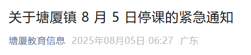 东莞市塘厦镇发布停课通知:决定 8 月 5 日塘厦镇中小学、幼儿园、校外培训机构、校外托管机构(以下简称“学校”)停课 1 天。