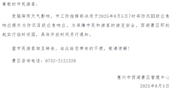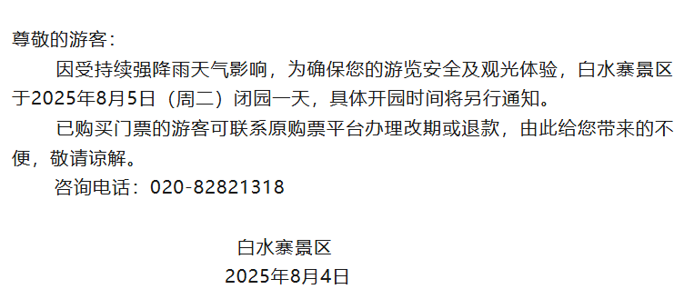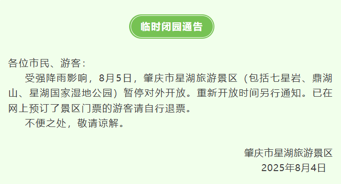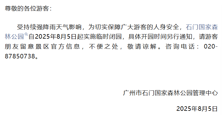 因受强降雨影响,8月4日晚至5日,广东多个景区(石门国家森林公园、七星岩、白水寨、惠州西湖景区等)发布临时闭园通知。