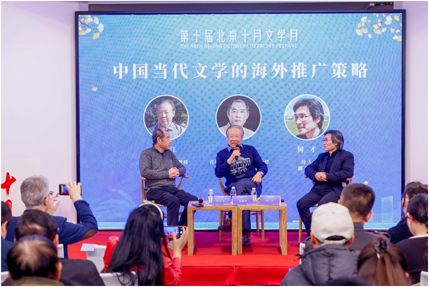 赵振江、刘文飞、树才围绕“中国当代文学的海外推广策略”展开讨论。