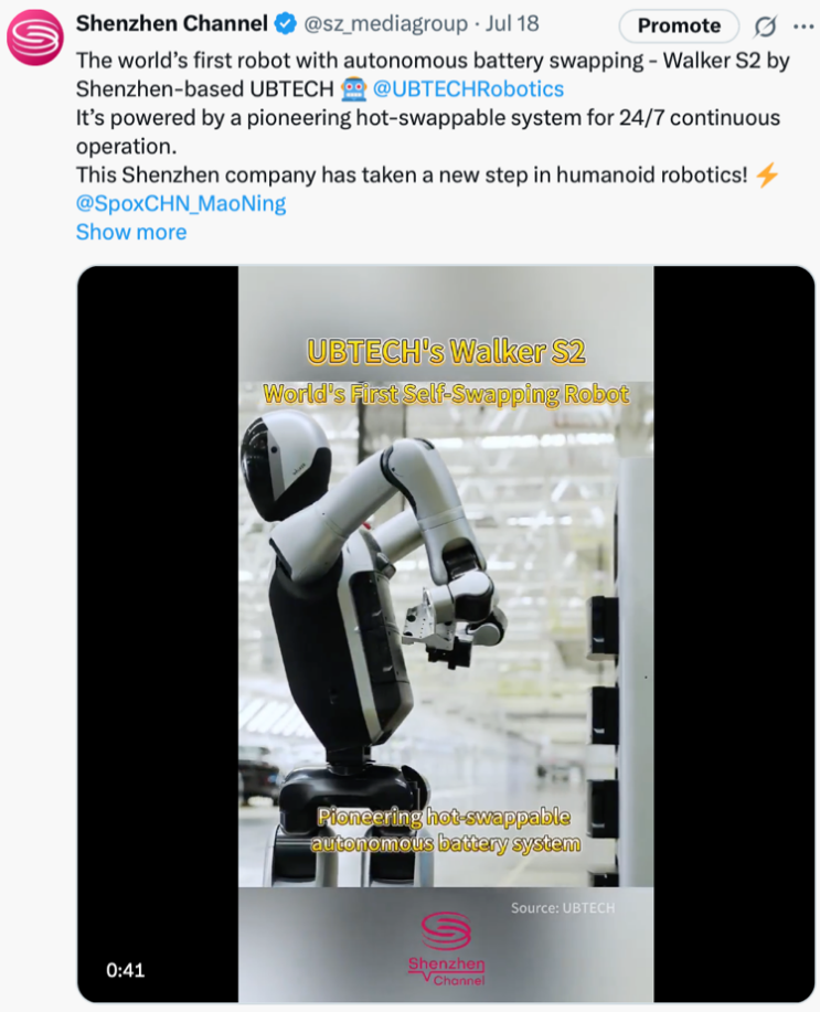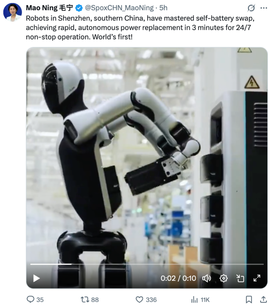 毛宁在推文中写道:“在中国南方的深圳,机器人已掌握自主换电技术,实现3分钟极速自动换电,可全天候不间断运行——全球首创!”