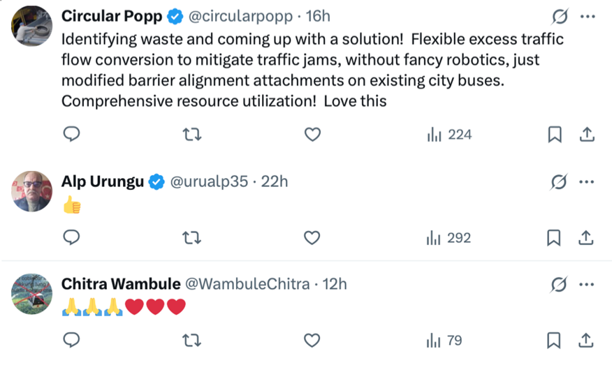 该视频也得到了网友们的点赞留言,外国网友评论称:“精准识别浪费并提供解决方案!通过灵活调整车道方向缓解拥堵,无需机器人,只需改装现有公交车护栏系统即可。资源利用最大化,我太喜欢这个点子了!”