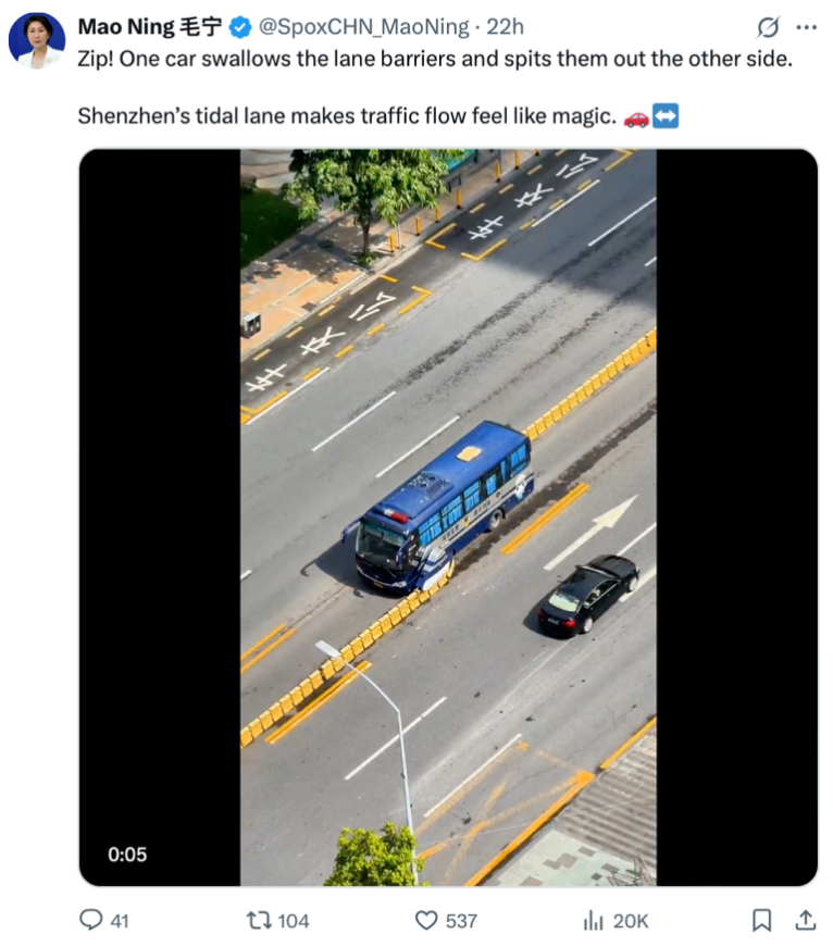 就在昨天(22日)下午,毛宁刚刚转发了关于深圳“潮汐作业车”的一条视频,并配文称:“清障车‘吞下’隔离带,又在另一侧‘吐出’,整个过程一气呵成。深圳的潮汐车道,让车流如魔法般流动。”