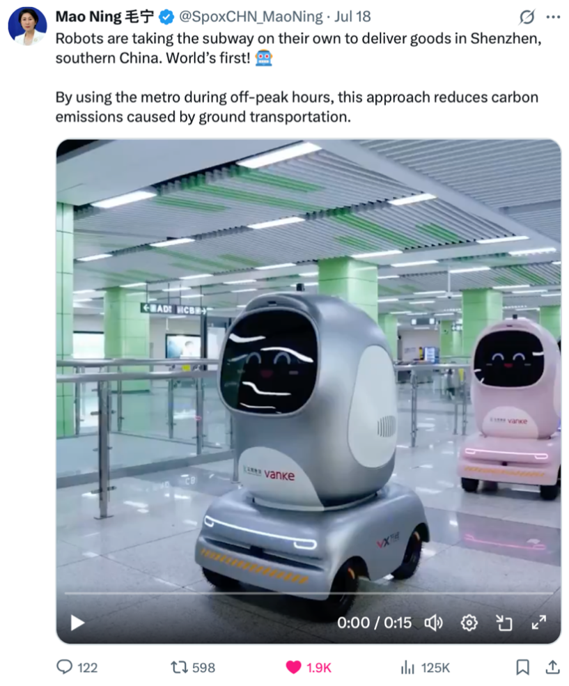 上周五(18日),毛宁还点赞并转发深圳地铁机器人自主配送的视频,短短一周内,在深圳人眼中属于 “日常操作”的三段视频,被外交部发言人“搬运”到海外社交媒体,频率之高,足见深圳“黑科技”在全球传播场的影响力正持续升温。