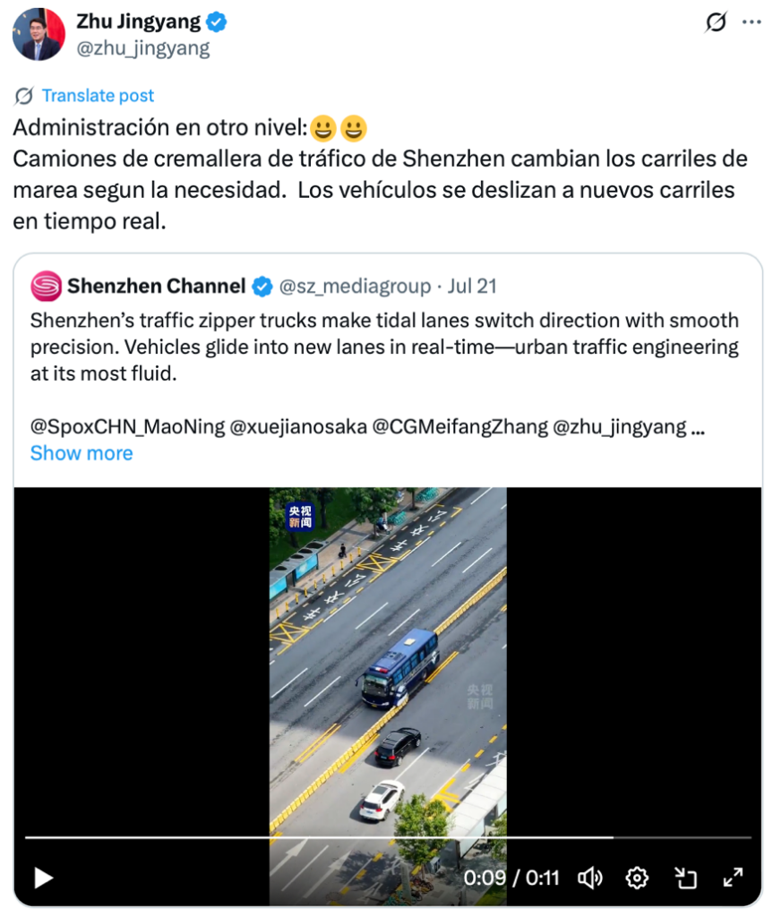 中国驻哥伦比亚大使朱京阳也在其个人账号转发深圳“潮汐作业车”的视频,并用西班牙语为 “深圳魔法” 点赞:“管理水平直接拉满!”